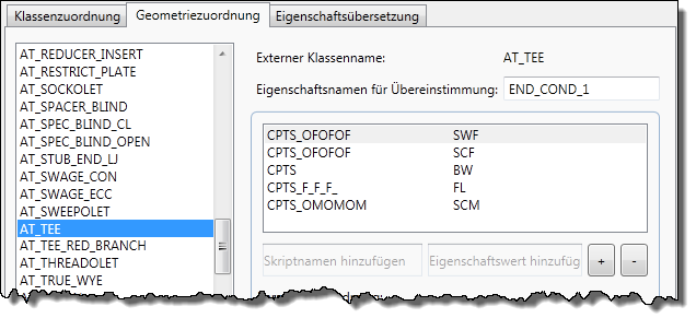 Jedes Skript verfügt über zugehörige Eigenschaften, die angeben, wie die Endtypen zu zeichnen sind. AutoPLANT- oder CADWorx-Eigenschaften werden an AutoCAD Plant 3D toolset-Versionen angepasst. In vielen Fällen soll eine Klasse möglicherweise je nach Kontext verschiedene Formen aufweisen. So soll z. B. AT_TEE (AutoPLANT) oder Tee (CADWorx) möglicherweise an verschiedenen Positionen über ein geschweißtes T-Stück, ein muffengeschweißtes T-Stück oder ein geflanschtes T-Stück verfügen. Sie können einen oder mehrere Eigenschaftsnamen als Übereinstimmungskriterien für die zu verwendende Grafikform angeben.