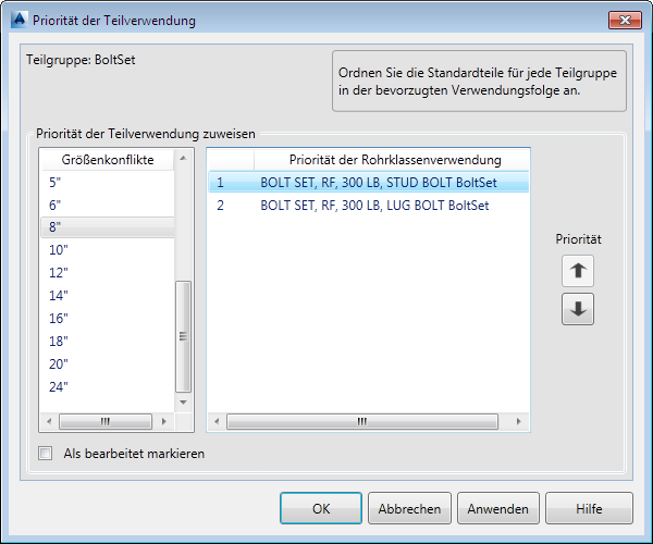 Ändern die Priorität der Teilverwendung. Sie müssen ein Rohrklassenteil festgelegt haben, um die Priorität ändern zu können.