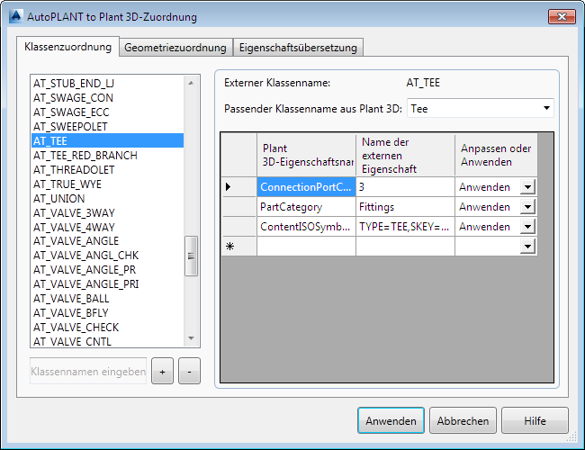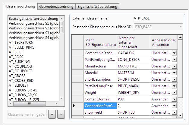 Globale Eigenschaften wie Langbezeichnung, Druckstufe, Wandstärkenreihe usw. können einmal für alle Klassen zugeordnet werden. Dagegen werden individuelle Klasseneigenschaften eins-zu-eins entsprechenden Plant 3D-Klasseneigenschaften zugeordnet.