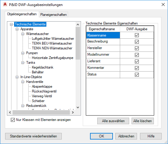 Vorgabemäßig werden alle Eigenschaften aus den Strukturen Technische Elemente und Nicht-technische Elemente aufgenommen.