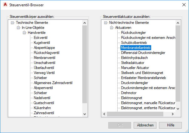 Wählt ein Armaturgehäuse und einen Aktuator für eine Steuerarmatur aus, die Sie in die Zeichnung platzieren.