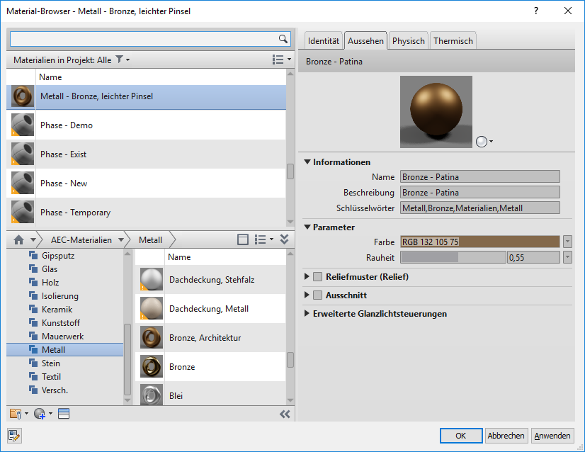 Verwenden Sie das Dialogfeld Material-Browser, um nach Materialien für Elemente zu suchen und sie zu verwalten.