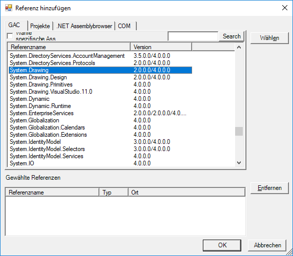Suchen Sie im Dialogfeld Verweis hinzufügen in der Liste nach System.Drawing und System.Windows.Forms, und wählen Sie diese Einträge aus. Halten Sie für die Mehrfachauswahl die Strg-Taste gedrückt. Beispiel: