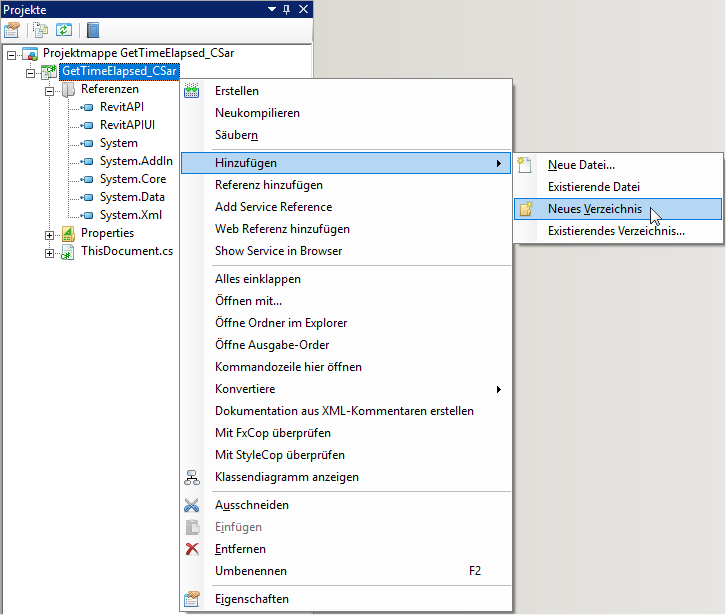 Wechseln Sie wieder zur Revit-IDE. Klicken Sie im Projektexplorer (um dieses Beispiel fortzusetzen) mit der rechten Maustaste auf den Ordner, den Sie für Ihr Makro erstellt haben, und wählen Sie Hinzufügen