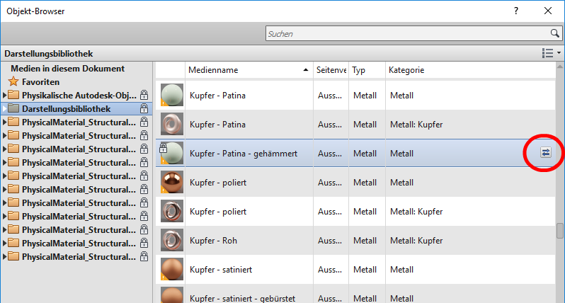 Sie können ein bestehendes Objekt durch ein anderes ersetzen, das Sie im Objekt-Browser auswählen. Die Eigenschaften des neuen Objekts werden für das Material übernommen.
