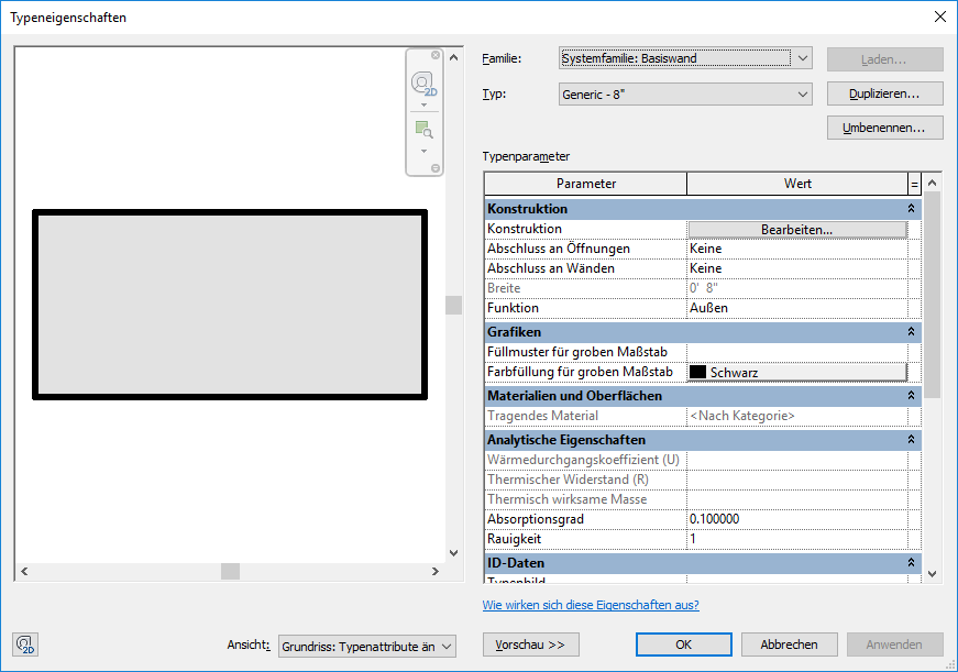 Im Folgenden sehen Sie ein Beispiel eines Dialogfeldes Typeneigenschaften für einen Wandtyp, bei dem das Vorschaufenster angezeigt wird.