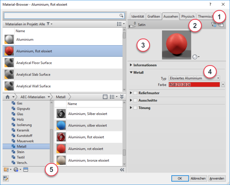 4 Eigenschaftenbereich: Hier können Sie detaillierte Eigenschaften des ausgewählten Objekts anzeigen und verwalten. Der Name und die Beschreibung des Objekts werden unterhalb des Bereichs Informationen angezeigt. Im Beispiel oben werden die Eigenschaften unter Metall für das Darstellungsobjekt Eloxiert - Rot angezeigt (d. h., dieser Abschnitt ist erweitert). Der Satz der für eine Flüssigkeit angezeigten Eigenschaften unterscheidet sich beispielsweise vom Satz der für Metall angezeigten Eigenschaften.
