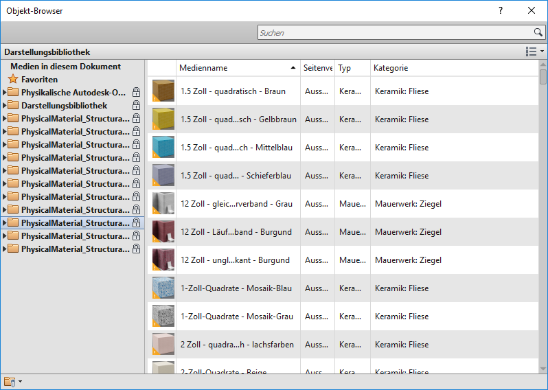 Symbol) für Materialien. Auf diese Weise wird sichergestellt, dass Ansichten und gerenderte Bilder die neuesten, hochwertigsten Darstellungen von Materialien verwenden.