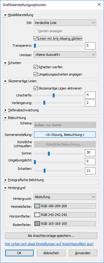 Für diese Ansicht werden die folgenden Einstellungen im Dialogfeld Grafikdarstellungsoptionen verwendet: