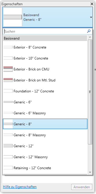 Wenn ein Werkzeug zum Einfügen von Elementen aktiv ist oder gleichartige Elemente in der Zeichnung ausgewählt sind, wird die Typenwahl oben in der Eigenschaftenpalette angezeigt.