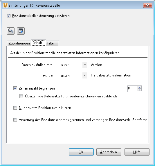 Beim Arbeiten mit Revisionen können Sie mehrere Versionen einer Zeichnung in einer Revision haben. Sie können festlegen, ob die erste oder die letzte Version der Revisionsdaten in der Revisionstabelle auf der Registerkarte Inhalt angezeigt werden soll.