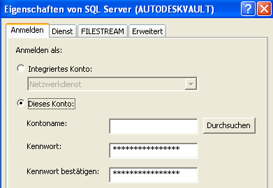 Anmerkung: Wenn Sie die Anmeldedaten für den Dienst ändern, werden Sie aufgefordert, den MS SQL Server-Dienst neu zu starten. Folgen Sie dieser Aufforderung, um die Änderungen zu übernehmen. Vergewissern Sie sich außerdem, dass Clients nicht den Autodesk Vault Server nutzen, bevor der SQL Server neu gestartet wurde.
