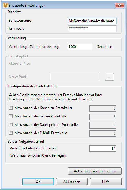 - Ändern Sie im Dialogfeld Erweiterte Einstellungen den Benutzernamen in MyDomain\AutodeskRemote, und geben Sie das entsprechende Kennwort ein.
