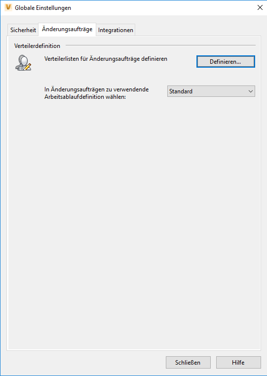 Bearbeiten von Verteilerlisten und Arbeitsablaufdefinitionen auf der Registerkarte Änderungsaufträge im Dialogfeld Globale Einstellungen.