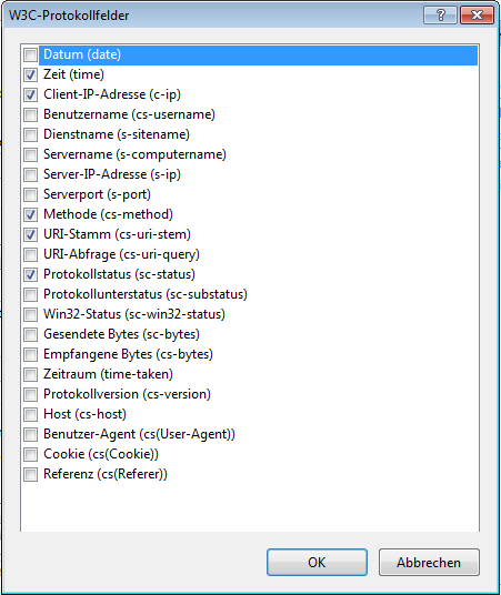 Das erweiterte W3C-Protokollierungsdateiformat ist die Vorgabeprotokolldatei für IIS. Es ist ein anpassbares textbasiertes ASCII-Format. Im IIS-Manager können Sie die Felder auswählen, die in der Protokolldatei verwendet werden sollen.