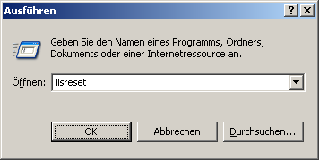- Wählen Sie im Startmenü von Windows Ausführen. Geben Sie iisreset ein, und klicken Sie auf OK, um IIS neu zu starten.