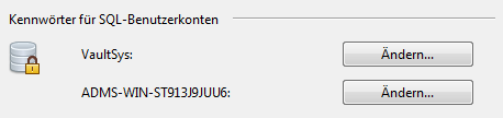 Bei der Installation von Vault werden vorgegebene Kennwörter für die SQL-Dienstkonten VaultSys und ADMS_%Site-Name% bereitgestellt. Der Administrator kann diese Vorgaben durch sicherere Kennwörter ersetzen.