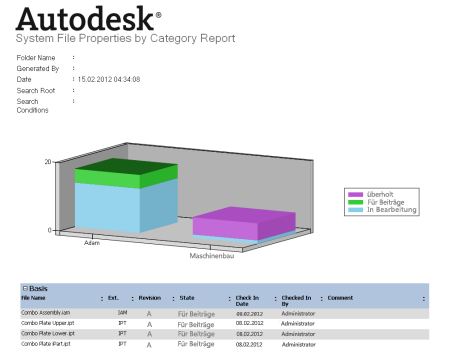In Autodesk Vault Client werden Berichtsvorlagen bereitgestellt. Diese Berichtsvorlagen enthalten eine Farbpalette für ein Diagramm. Die Vorlagen geben aber nicht an, welche Farbe welchem Diagrammelement zugewiesen ist. Wenn Sie die Datenzuordnungsfunktion verwenden, können Sie angeben, wie die Diagrammelemente farbcodiert werden. Die Farbcodierung der Diagrammelemente gewährleistet eine schnelle und wiederholbare Anzeige der Modelldaten.