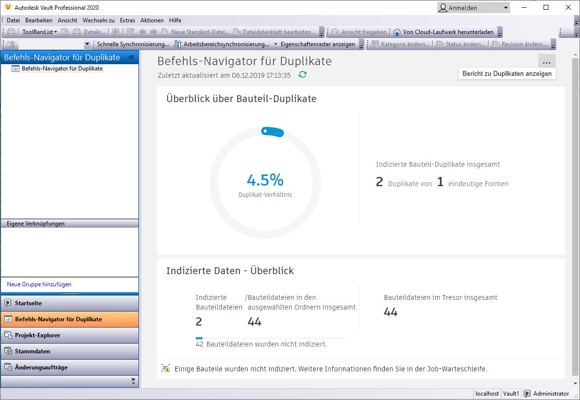 Verwenden Sie den Befehls-Navigator, um den Status von doppelten und indizierten Bauteilen anzuzeigen.