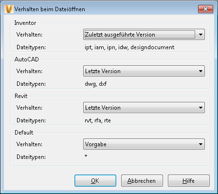 Legen Sie fest, ob Inventor-, AutoCAD- und Revit-Dateien mit der neuesten Version, der zuletzt ausgeführten Version oder der zur Speicherung der Datei verwendeten Version der CAD-Anwendung geöffnet werden.