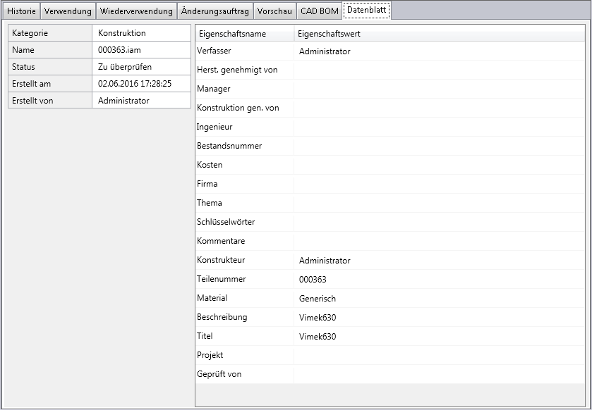 Im Vault-Client und Vault Office-Client werden vorgabemäßig zwei neue Registerkarten angezeigt, wenn Data Standard installiert ist (CAD-Stückliste und Datenblatt).