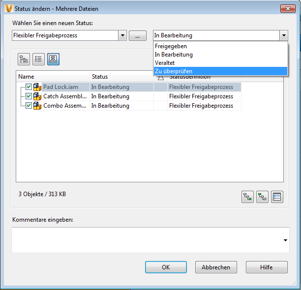Für den Befehl Status ändern können mehrere Dateien, Ordner, Artikel oder benutzerdefinierte Objekte ausgewählt werden. Wenn mehrere Tresorobjekte ausgewählt sind, prüft Autodesk Vault den Status der einzelnen Objekte in der Auswahl. Für Dateien, deren Status nicht geändert werden kann, wird der Befehl Status ändern im Menü Aktionen und im kontextsensitiven Menü abgeblendet.