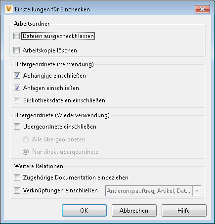 Wenn Sie das Dialogfeld Einchecken unterdrücken, können Sie angeben, welche Auswirkungen der entsprechende Tresorvorgang auf die zugehörigen Dateien hat.
