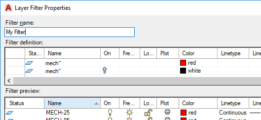 In this example, the layer property filter includes layers that start with "mech" and are red or layers that start with "mech", are off, and white.