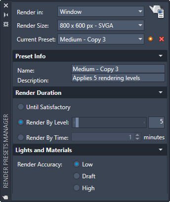 Render By Level. Specifies the number of levels, or iterations, the render engine performs to create the rendered image. (RENDERLEVEL system variable)