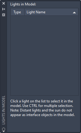 An icon in the Type column indicates the type of light: point light, spotlight, or distant light, and whether it is on or off. Select a light in the list to select it in the drawing. To sort the list, click the Type or Name column head.