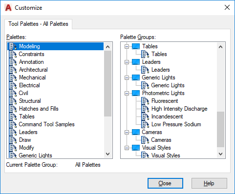 Displays a tree view of your tool palette groups and the tool palettes contained in each.