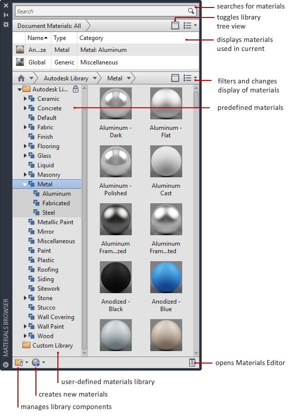 - User Library. Contains materials that you can share with other drawings. You can copy, move, rename, or delete user libraries. You can access and open existing user libraries created locally or on a network and add them to your defined libraries in the Materials Browser. The libraries are stored in a single document and can be shared with other users. However, any custom texture files used by the materials in a user library must be manually bundled with the user library.