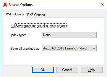 If you save to an earlier format, or the drawing contains custom objects from another application, select Save Proxy Images of Custom Objects to save images of the custom objects in the drawing file. (PROXYGRAPHICS system variable)