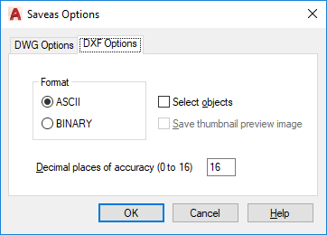 Specifies whether to create an ASCII or a binary DXF file. ASCII-format DXF files can be read with a text editor and are compatible with a wider range of applications. Binary-format DXF files are more compact. Read and write operations with binary-format files is faster than with ASCII-format files.