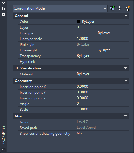 1. To display the Properties palette, double-click the coordination model or the bounding box around the model.