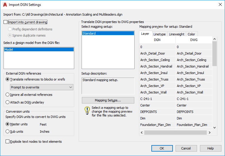 Converts DGN references to blocks when importing into a current drawing and to xrefs when importing into a new drawing.