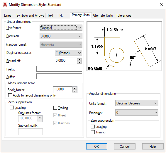 Sets the format and precision of primary dimension units and sets prefixes and suffixes for dimension text.