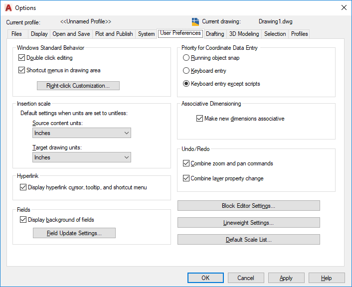Displays the Right-Click Customization dialog box. This dialog box provides further definition for the Shortcut Menus in Drawing Area option. ( SHORTCUTMENU system variable)