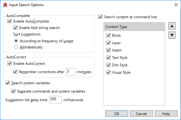 The command line suggestion list provides a quick way to access commands, system variables, and named objects (content) such as blocks by typing part of the name on the command line. Settings specify which items are displayed, their order, the delay before the list expands, and how much help the program provides as you type. You can also set whether the list displays suggestions only for commands and content that start with the letters you type, or also for commands and content that contain those letters (mid-string search.)