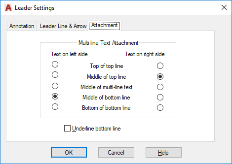 Sets the attachment location for leader lines and multiline text annotation. This tab is available only when Mtext is selected on the Annotation tab.
