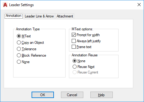 Sets the leader annotation type. The type you select changes the QLEADER leader annotation prompt.