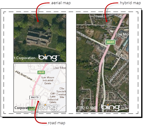 You can display the map as a satellite image (aerial style map) or as a vector image (road style map). You can also display the map as a hybrid of the aerial and road styles. If the drawing area is divided into multiple viewports, each viewport can have a different style of map.