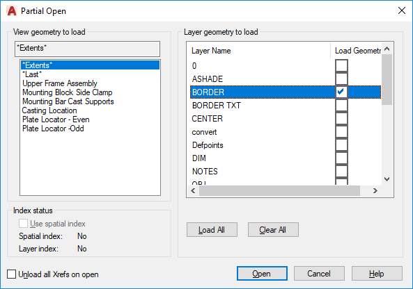 You can select and load geometry from a view or a selected area and from layers. You cannot unload any information that is currently loaded in the drawing. If the drawing contains attached xrefs that were not loaded at the time that the drawing was partially opened, you can reload the xrefs by using the External References palette. See XREF.