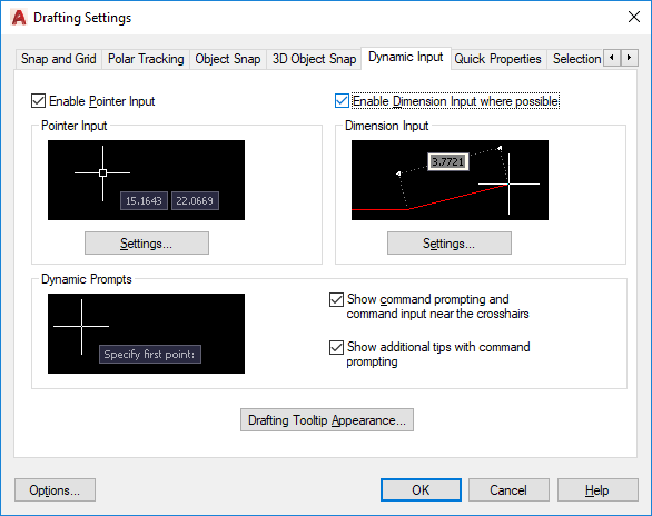 Controls pointer input, dimension input, dynamic prompting, and the appearance of drafting tooltips.