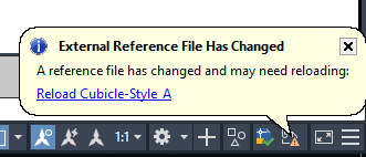 By default, if a referenced file has changed, a balloon message is displayed near the Xref icon in the lower-right corner of the application window (the status bar tray). Click the link in the balloon to reload all changed xrefs.