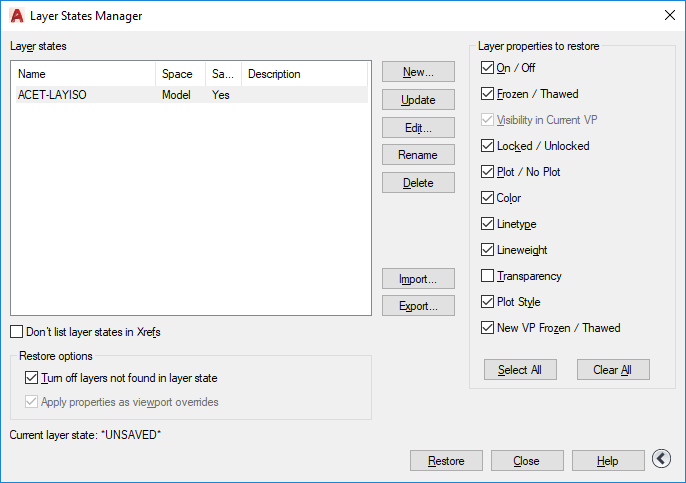 • When a layer state is imported from a drawing, layer properties such as a linetype or plot style that are not available in the current drawing, are imported from the source drawing.