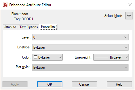 Defines the layer that the attribute is on and the lineweight, linetype, and color for the attribute text. If the drawing uses plot styles, you can assign a plot style to the attribute using the Properties tab.