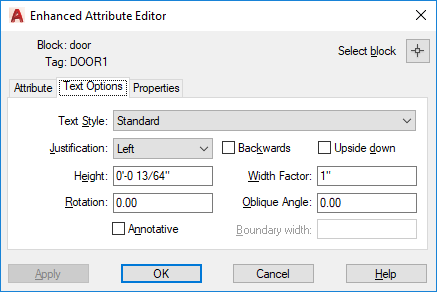 Sets the properties that define the way an attribute's text is displayed in the drawing. Change the color of attribute text on the Properties tab.