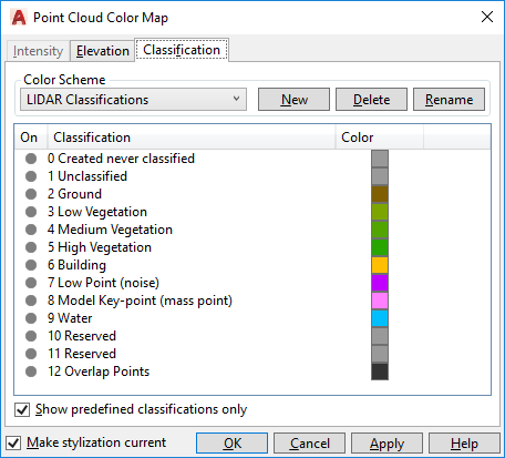 Edits the color scheme settings for Classification point cloud stylization.
