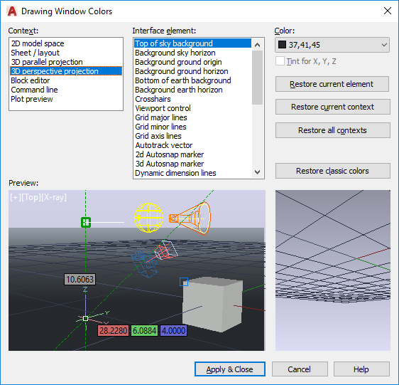 A context is an environment such as model space. Interface elements can have different colors assigned depending on the context. The context you select displays a list of associated elements. Select a context, an interface element, and then a color.